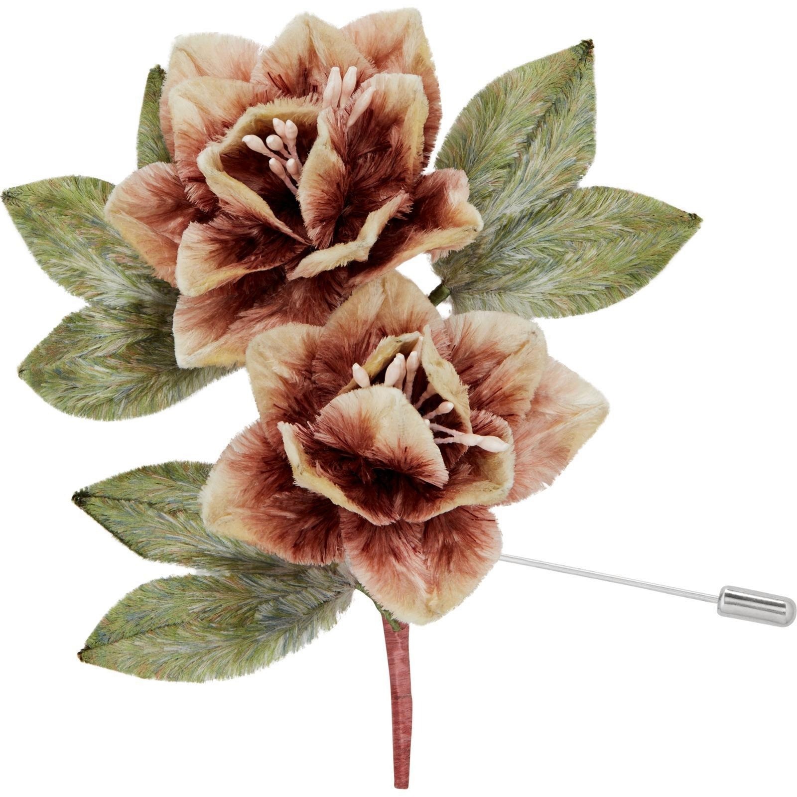 The technique is entirely handmade. Natural silk threads are wound around fine copper wire and hooked into velvet strips (a process called hooking). A craftsperson then uses scissors to cut and shape these strips into precise forms (trimming), before assembling the elements into the final flower or object (combining). The result has a texture and colour depth that no machine process has ever replicated — the silk's natural lustre, the dimensional softness of each petal.
