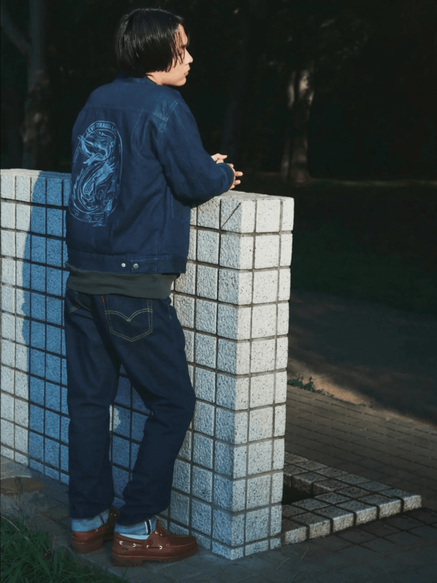 Traditional Buddhist Iconography Featured on: Denim Details and Embroidered Elements The lotus flower, representing purity and spiritual awakening in Buddhist philosophy, along with other sacred symbols from the caves, forms the foundation of the collection's decorative elements. These timeless symbols of enlightenment and spiritual growth are carefully integrated into Levi's classic denim silhouettes.