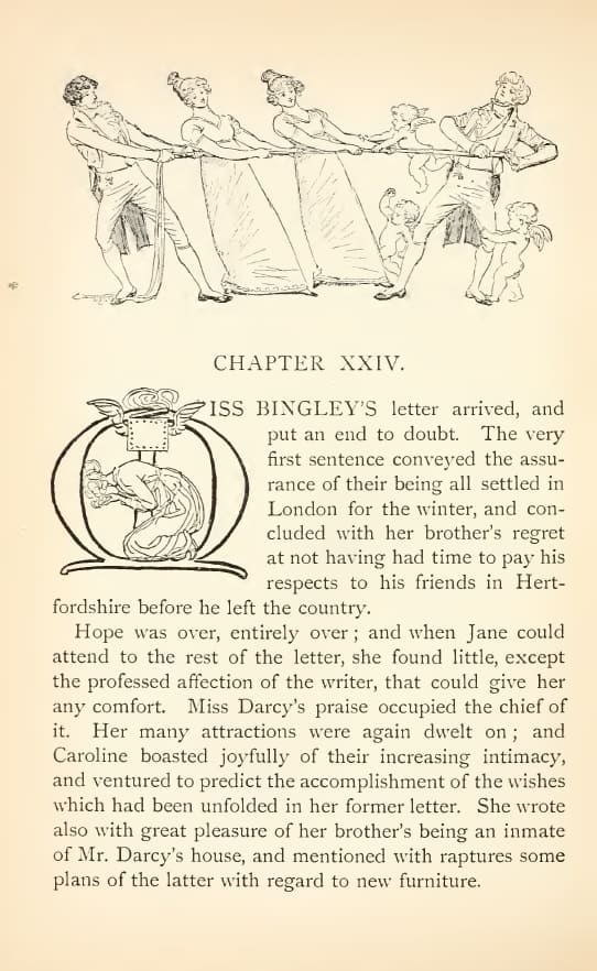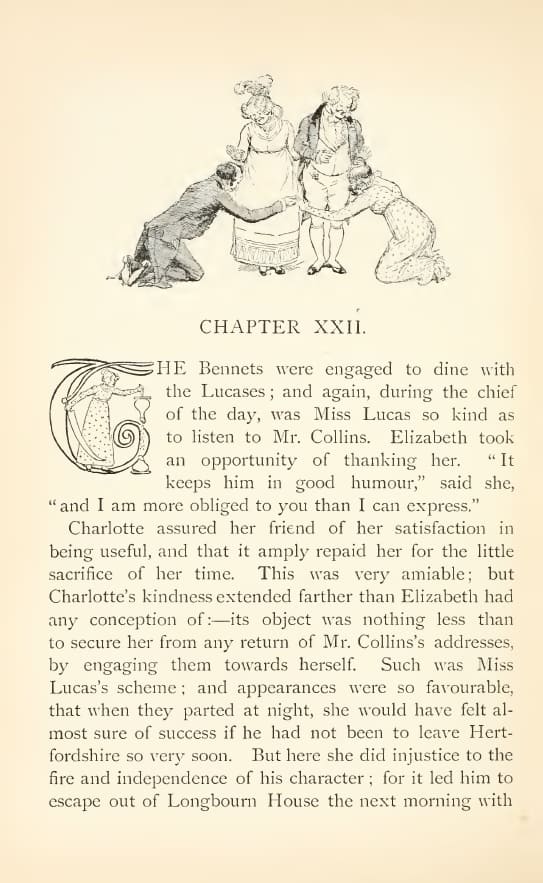 Visually, the novel has been defined by distinct artistic eras. The 1894 "Peacock Edition," illustrated by Hugh Thomson, remains the definitive visual interpretation for collectors. Thomson’s delicate pen-and-ink drawings and the iconic gold-gilded peacock cover captured the grace of the Regency period, solidifying the book's aesthetic as one of elegance and nostalgia. Later, in 1907, C.E. Brock provided another influential visual layer with colour plates that emphasized the domestic warmth and costume detail of the Bennet household, shaping how future generations would envision the world of Longbourn.